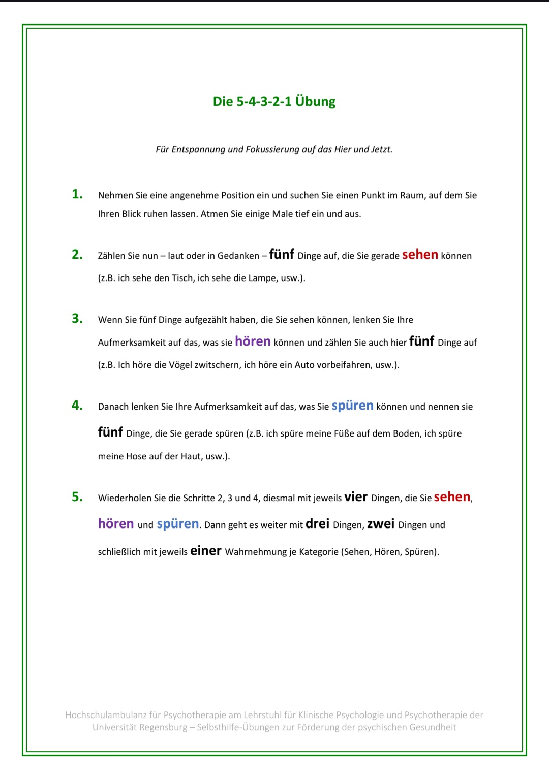"Die 5-4-3-2-1-Methode ist eine Achtsamkeitsübung, die Stress abbaut, indem sie die Sinne nutzt, um Sie ins Hier und Jetzt zurückzubringen: Sie benennen 5 Dinge, die Sie sehen, 4 Dinge, die Sie spüren (fühlen), 3 Dinge, die Sie hören, 2 Dinge, die Sie riechen und 1 Sache, die Sie schmecken. Diese Technik hilft bei Angst, Panikattacken oder Überforderung, indem sie Ihre Aufmerksamkeit von sorgenvollen Gedanken auf die konkrete Umgebung lenkt und somit eine beruhigende Wirkung hat."