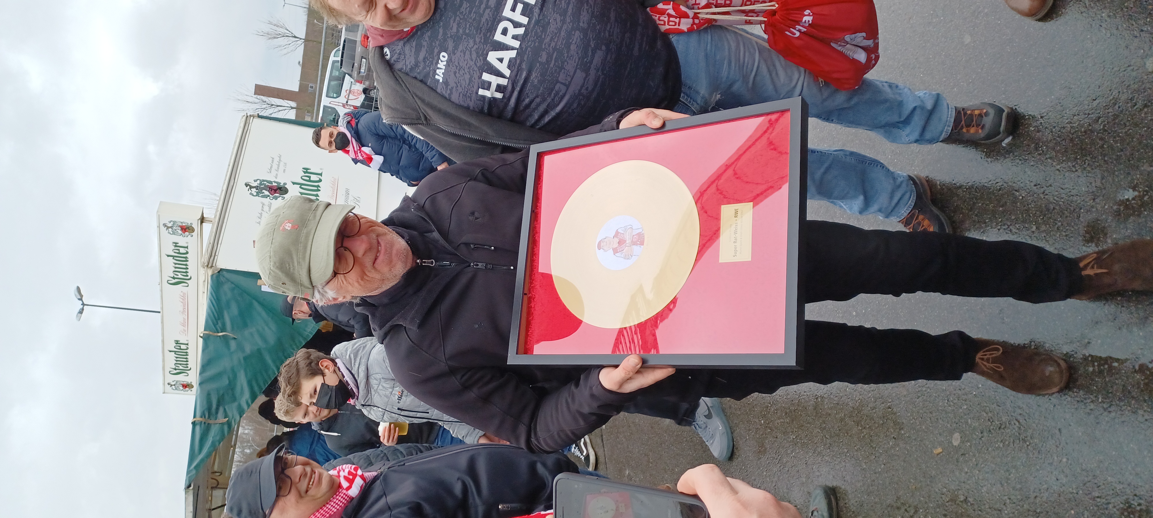 Vor vier Jahren bekam unser @flemming-lund stellvertretend für seine Muriel Spark die Güldene Schallplatte für den Gassenhauer "Super Rot-Weiss - RWE" überreicht.